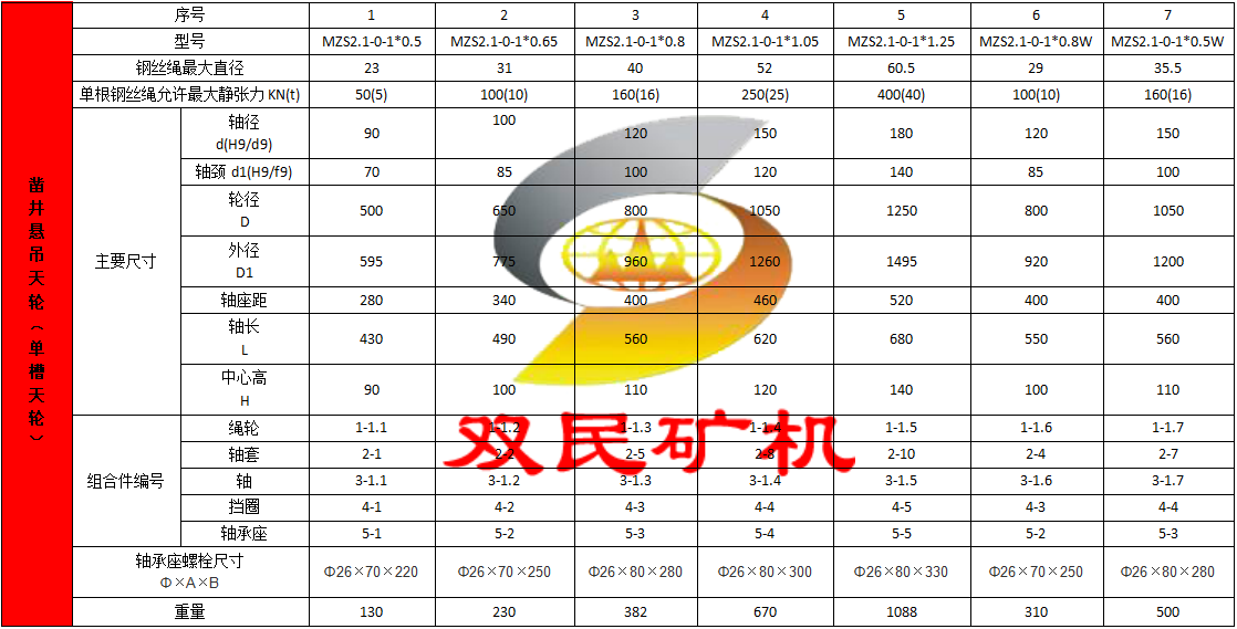 鑿井懸吊天輪是按JZ系列鑿井絞車鋼絲繩最大靜張力分別為5t(50kN),10t(100kN),16t(160kN),25t(250kN),40t(400kN)進行配套設計的。
