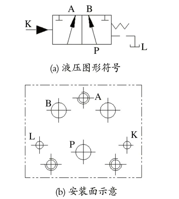 液動換向閥是利用控制油路的壓力油在閥芯端部所產生的液壓力來推動閥芯移動,從而改變閥芯位置的換向閥。提升機雙泵液壓站上常用的國產 23Y 型板式液動換向閥如圖2 所示。其安裝面上有 2 個進 (出)油口 B 和 A、1 個出 (進) 油口 P、1 個控制油口 K,以及 1 個泄油口 L。在雙泵液壓站中,液動換向閥在泵裝置切換時使用,工作泵裝置連接 A 口,備用泵裝置連接 B 口。工作泵裝置運行時,閥芯在彈簧力的作用下被推向左側,壓力油經 A → P 流向液壓閥組供油孔;當工作泵裝置故障時,電控系統控制工作泵的電動機斷電,備用泵的電動機通電,閥芯在控制油 K 的作用下被推向右側,壓力油經 B → P 流向液壓閥組供油孔;至此,完成備用泵裝置的切換。