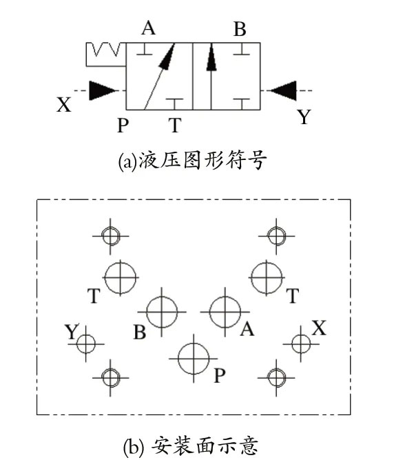 雙泵液壓站上使用的板式液動換向閥安裝在閥組油路塊上,通過油路塊上設計的油孔及螺釘安裝孔進行連接。圖2 所示為 23Y 型板式液動換向閥,其安裝面上油口眾多。當然,進口廠家也有板式液動換向閥可供選擇,但是其安裝面上同樣油口眾多。美國PARKER 的 D3DP26D2N 板式液動換向閥如圖3 所示,該換向閥在雙泵液壓站上也有使用。A 口、B 口和 P 口為閥的工作油口,X 口和 Y 口為控制油口。安裝面上油口眾多,這給閥組油路塊的油孔設計增加了難度。此外,板式液動換向閥還存在閥芯容易卡阻、彈簧使用壽命短等問題,這都是制動系統運行中存在的安全隱患。