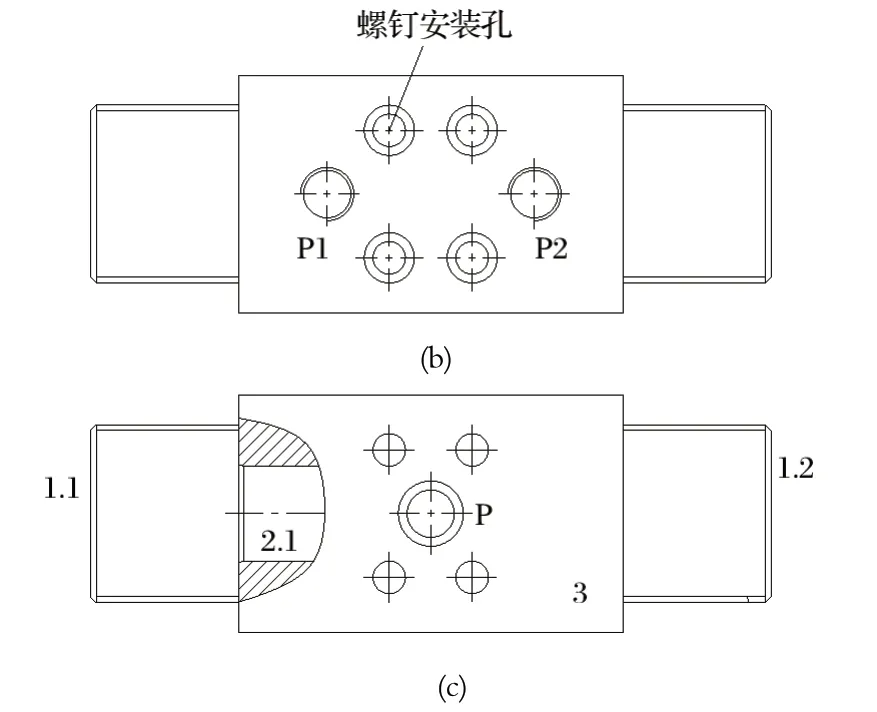 (2) 將兩個(gè)插裝閥組合設(shè)計(jì)成一個(gè)獨(dú)立的液動(dòng)換向閥,再安裝到閥組油路塊上。如圖6 所示,獨(dú)立的液動(dòng)換向閥包含一個(gè)獨(dú)立的閥體 3,兩端分別安裝有一個(gè)插裝組件 2 和一個(gè)控制蓋板 1;閥體內(nèi)部設(shè)計(jì)有油孔,用于連接兩端的插裝閥;閥體外側(cè)安裝面上設(shè)計(jì)有兩個(gè)進(jìn)油孔 P1 和 P2,通過管接頭連接兩個(gè)泵裝置;閥體內(nèi)側(cè)安裝面上設(shè)計(jì)有一個(gè)出油孔 P,閥組油路塊上只需要設(shè)計(jì)一個(gè)與出油孔 P 配套的供油孔即可;閥體上設(shè)計(jì)有螺釘安裝孔,用于將液動(dòng)換向閥安裝在閥組油路塊上。