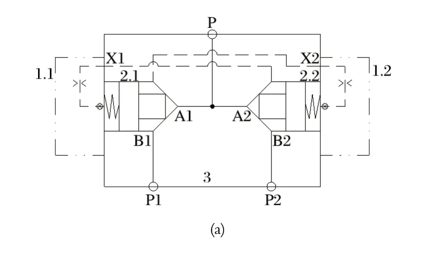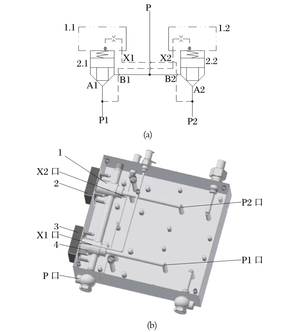新型液動(dòng)換向閥是由兩個(gè)二通插裝閥組合而成的選擇回路,具備二位三通方向控制閥功能,以實(shí)現(xiàn)兩套泵裝置的切換。中信重工 E6118B/E6119B 型液壓站的液壓閥組如圖5 所示。圖5 中,當(dāng) P1 處的泵裝置工作時(shí),插裝組件 2.1 打開,插裝組件 2.2 關(guān)閉,由 P1 處的泵裝置向 P 口供油,P2 處的泵裝置可以維修或停用待命;反之,當(dāng) P2 處的泵裝置工作時(shí),插裝組件 2.2 打開,插裝組件 2.1 關(guān)閉,由 P2 處的泵裝置向 P 口供油,P1 處的泵裝置可以維修或停用待命。