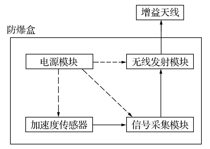 基于振動波周期法研制的礦用罐道繩張力檢測裝置如圖3 所示。無線測量儀的原理框圖如圖4 所示。無線測量儀外部設(shè)有防爆外殼,將電源模塊、加速度傳感器、無線發(fā)射模塊、信號采集模塊等單元密封在內(nèi)。
