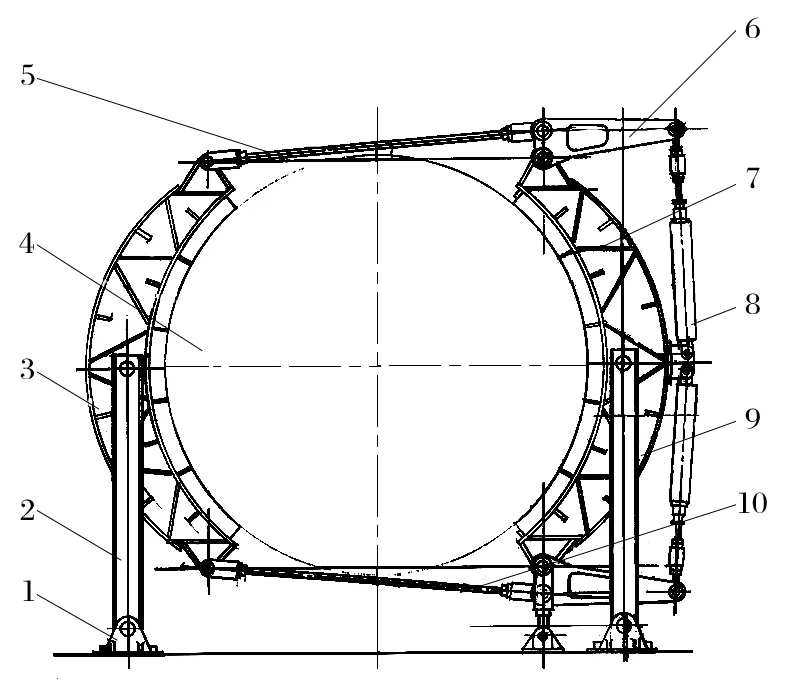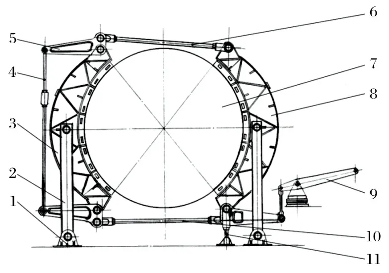 (6)方案簡單 對于滾筒直徑大于4 m 的舊式提升機(jī),推 薦采用氣壓-重錘平移式制動器。該改造方案不僅保留了滾筒制動輪構(gòu)件、基礎(chǔ)、前后制動梁,還保留了三角杠桿和頂部拉桿,方案更為簡單。以 HKMZ 型提升機(jī)為例,改造前后分別如圖4、5 所示。對比兩圖可知,改造量更少,因而成本更低,且造型美觀,達(dá)到了預(yù)期的效果。
