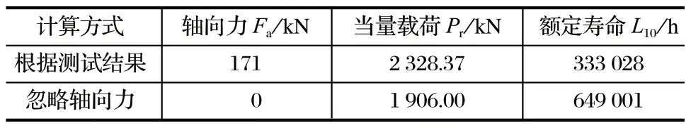 根據傳統方法得到軸向力為 0 kN,測試方法得到軸向力為 171 kN。按照軸承壽命計算公式,利用兩方法分別計算,其結果如表2 所列。