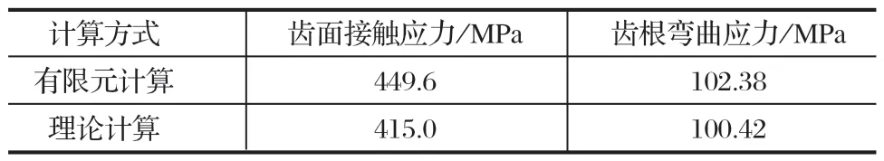 由圖6、7可知,齒面zui大接觸應力出現(xiàn)在齒面分度圓附近,為449.6M Pa;zui大彎曲應力出現(xiàn)在接觸齒面對側齒根,為102.38MPa。仿真結果與理論計算結果對比如表3所列,可見有限元模型計算結果與理論計算結果相一致,接觸應力的誤差為8.3%,彎曲應力的誤差為1.9%,選取材料的安全系數(shù)為2,則計算結果均低于材料許用應力792M Pa,說明該模型精度可靠,齒輪滿足靜強度計算需求。