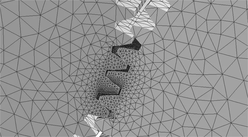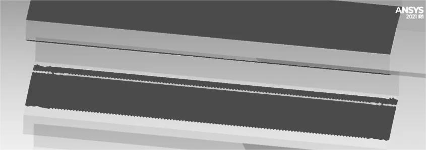 在 SolidWorks 中對同步齒輪進行建模并調整,確保同步齒輪不會出現(xiàn)干涉。為了提高仿真精度和數(shù)據的可靠性,對靜強度仿真過程中參與嚙合的幾對輪齒表面網格化。齒面網格細化模型如圖5所示。