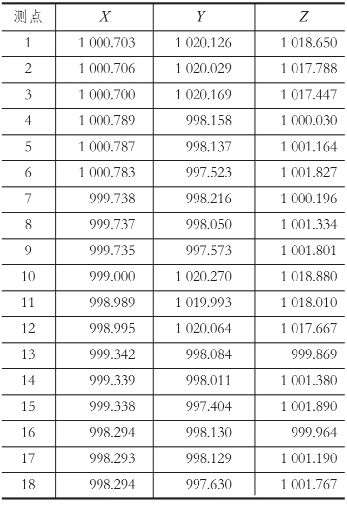 在機房內選擇通視條件良好的位置架設全站儀,建立假定坐標系,取測站坐標 O(1000,1000,1000),在每個天輪繩槽中間測定 1 組數據 (每組 3 點),共測定 2 組;在卷筒擋繩板兩側內壁各測定 1 組數據 (每組 3 點),共 4 組。測量的數據如表 1 所列。表中,測點 1~ 3 為 1 號天輪實測坐標,4~ 9 為 1 號天輪對應坐標,10~ 12 為 2 號天輪實測坐標,13~ 18 為 2 號天輪對應坐標。