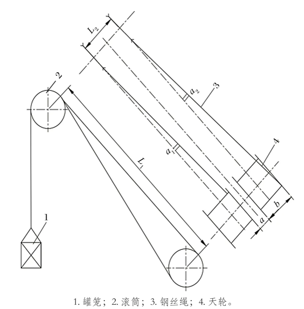 天輪內外偏角示意如圖 1 所示,為了確定是否因鋼絲繩內外偏角偏大導致的鋼絲繩異常磨損,需要對提升機的內外偏角進行測量。由圖 1 可知,α1 為天輪鋼絲繩內偏角,α2 為天輪鋼絲繩外偏角,當鋼絲繩處于左右擋繩板附近時,鋼絲繩與天輪的偏角達到zui大。