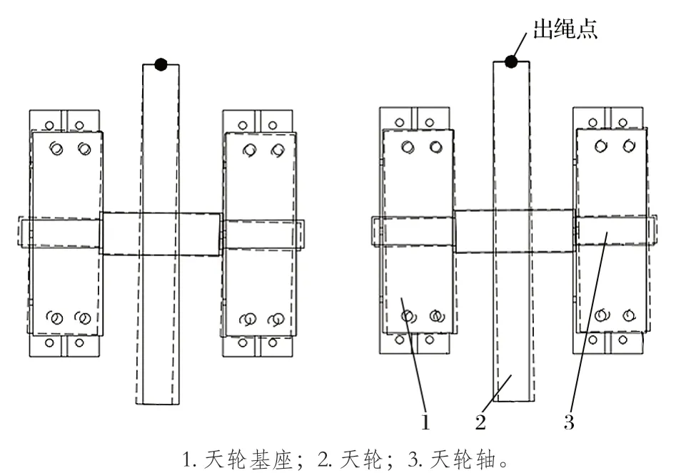確定好旋轉基準點后,以此點為圓心調整 1 號天輪基座,1 號天輪基座沿出繩點順時針水平旋轉一定角度,使天輪入繩點對準滾筒中 心布置,使得天輪鋼絲繩的內外偏角基本相等;2 號天輪基座逆時針旋轉一定角度,對準其所對應的滾筒的中 心位置,全部轉到指 定位置后,對基座進行固定,如圖 3 所示。
