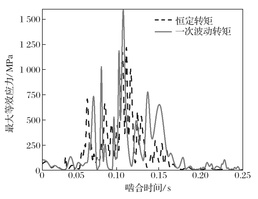 在有限元模型中,利用探針提取從動(dòng)輪一個(gè)齒面與一個(gè)齒根面的zui大等效應(yīng)力。觀察恒定轉(zhuǎn)矩的zui大等效應(yīng)力變化,當(dāng)齒輪嚙合時(shí)間到達(dá)0.11s 時(shí),位于從動(dòng)輪齒面與齒根面的zui大等效應(yīng)力達(dá)到zui大,zui大等效應(yīng)力處于齒根處;應(yīng)力的變化趨勢整體呈現(xiàn)出金字塔形;隨著同步齒輪嚙合的進(jìn)行,zui大等效應(yīng)力的幅值逐步升高;達(dá)到zui高點(diǎn)之后,應(yīng)力幅值又逐步降低,表明嚙合過程的結(jié)束。因?yàn)辇X輪嚙合過程中是單齒對接觸與兩齒對接觸交替出現(xiàn)形式,所以會出現(xiàn)zui大等效應(yīng)力的波動(dòng)。當(dāng)處于單齒對接觸時(shí),應(yīng)力波動(dòng)大,同時(shí)應(yīng)力值將達(dá)到zui大;在雙嚙合區(qū),其所受載荷與接觸壓力較平穩(wěn),受到?jīng)_擊較小,且應(yīng)力波動(dòng)較小。