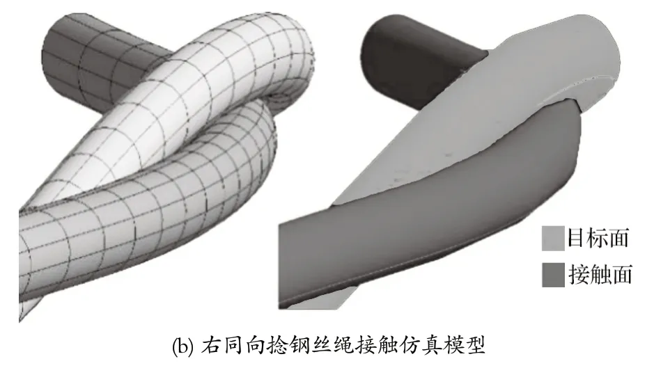 實(shí)際加載時(shí),右同向捻的鋼絲繩一端固定,在鋼絲繩的一端進(jìn)行加載。從圖7(a) 可以看出,此時(shí),加載端的鋼絲繩產(chǎn)生與繩股捻制方向相反的變形,并且在繩槽底部接觸位置的應(yīng)力較大,這個(gè)應(yīng)力是使鋼絲繩出現(xiàn)扭轉(zhuǎn)變形的主要原因。所以說,靠近繩槽底部的變形其實(shí)是比較小的。此外,整個(gè)系統(tǒng)中位于繩槽位置處的位移變化相對(duì)較大。從圖7(b) 可以看出,鋼絲繩和天輪在接觸位置處受到集中應(yīng)力的作用,呈現(xiàn)出層狀的分布規(guī)律;在鋼絲繩和天輪接觸點(diǎn)內(nèi)側(cè)表現(xiàn)為壓應(yīng)力,外側(cè)表現(xiàn)為拉應(yīng)力,并且同向捻制鋼絲繩股內(nèi)變形大于右交互捻;鋼絲繩的外層絲等效應(yīng)力表現(xiàn)出等幅波動(dòng),幅度變化也呈現(xiàn)出一定的規(guī)律性;在鋼絲繩模型加載位置端和約束端面上,受到約束作用,導(dǎo)致應(yīng)力突然集中,在端面位置的等效應(yīng)力其實(shí)是大于股內(nèi)鋼絲其他位置的等效應(yīng)力。